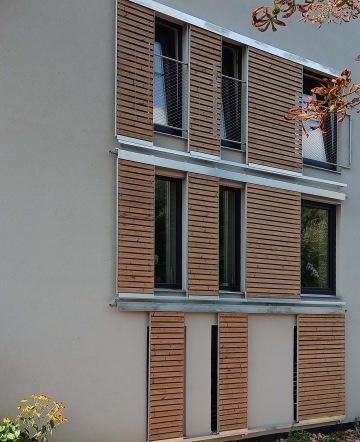Vstup z terénu je možný jak do přízemí, tak do patra. V suterénu je díky bazilikálnímu osvětlení možné umístění našeho architektonického ateliéru (www.architekt-hladik.cz). Zalomení pro tato okna vytváří v obývacím pokoji lavici. Štít směřuje jihovýchodním směrem a skýtá úchvatný výhled na výše zmíněný rybník. Dům je postaven z voštinových cihel, které nabízejí kromě energetické úspornosti i akumulační komfort. Jihozápadní stěna je opatřena dřevěnými lamelami z tepelně upraveného borového dřeva. Lamely jsou pevné a jsou naklopeny tak, aby v letních měsících bránily přímým slunečním paprskům a nedocházelo tak k přehřívání interiéru. Naopak v chladnějších měsících, kdy je slunce nízko se jeho světlo a teplo dostává mezi lamelami dovnitř a teplé tóny dřeva příjemně prohřívají místnosti za okny. Posuvné okenice jihovýchodního štítu umožňují regulovat sluneční světlo a teplo dle aktuální potřeby. Kromě praktické funkce dodávají lamely a okenice domu jemnost a měkkost.