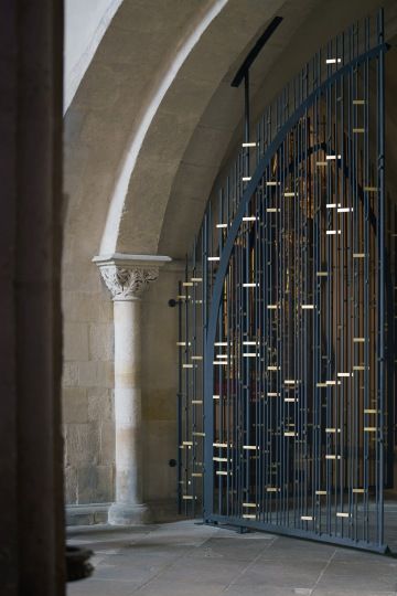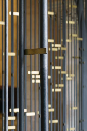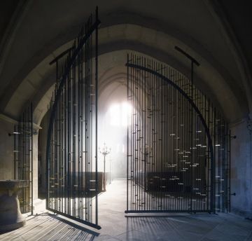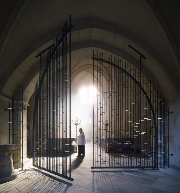 Autory mříže jsou Ing. arch. Tomáš Hladík, Ing. arch. Antonín Hůla a Ing. arch. Vojtěch Ertl. Vlastní mříž realizoval MgA. Martin Janda. Vzhledem k velikosti mříže respektive otevíravé brány byla realizace poměrně náročná a vyžadovala použití technologií, které nemají jinde obdobu. Například ohýbané L profily tvořící rám křídel jsou patrně největší, jaké dosud byly v Evropě použity.