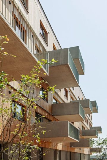 Každý blok je postaven kolem betonového ohraničení, s vysokými izolovanými vnějšími stěnami z prefabrikovaného dřeva, které jsou obložené modřínovými prkny. Rámová konstrukce umožnila v návrhu fasád větší svobodu, přičemž do ulice byly navrženy a vytvořeny vyčnívající betonové balkony, zatímco do vnitřního dvora směřují větší otevřené balkony, které obyvatelům poskytují prostor pro posezení a pěstování rostlin.