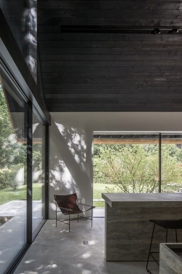 Na západě je obývací pokoj u krbu zabudovaného ve zdi a na východě je garáž a úschovna kol zakončená skrytými dveřmi. Obývací i jídelní část se díky použití celoskleněnému vyplnění štítů s minimálními rámy snaží navázat užší spojení s okolními lesy. Skleněné dveře zajišťují vstup na terasu, která vede po obvodu domu. „Otevřením domu do čtyř stran vzniká půdorys ve tvaru kříže s novým zónováním na pozemku, ale také novými vnitřními vztahy v domě,“ vysvětluje Sofie.