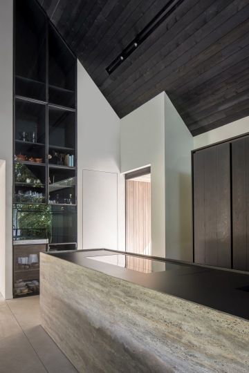 Nejdelší část budovy, která se rozkládá směrem na jih, dává místo pro velkou kuchyň a jídelní prostor organizovaný kolem kamenného ostrova a snídaňového baru.