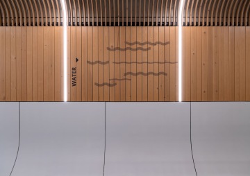 Interiér nádraží je designován s důrazem na přirozené osvětlení a prostorné interiéry bez rušivých sloupů. Velká prosklená okna umožňují proudění denního světla a zároveň nabízejí výhled na okolní prostředí, což přispívá k pocitu otevřenosti a bezpečí uživatelů.
