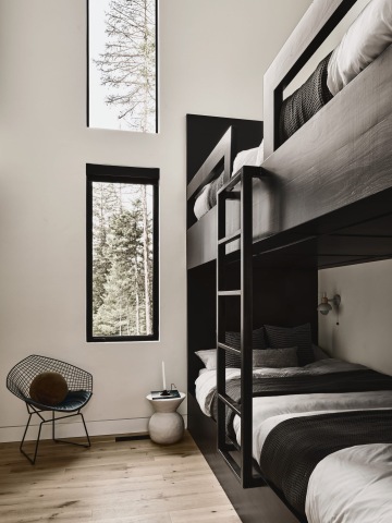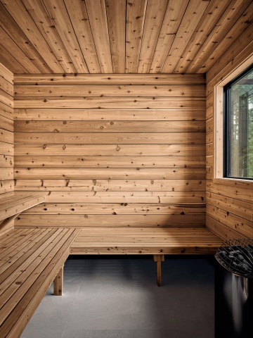Interiér o rozloze 324 m² kombinuje vzdušnost a přírodní materiály. Jižní část domu zahrnuje garáž a otevřenou zónu kuchyně, jídelny a obývacího pokoje. Severní křídlo nabízí soukromí – najdeme zde dvě ložnice s vlastní koupelnou, společenskou místnost a dva pokoje s palandami. Velkolepá společenská místnost vyniká téměř osm metrů vysokým stropem. Vysoká okna na všech stranách poskytují panoramatické výhledy na okolní borovicový les a zároveň přinášejí dostatek přirozeného světla. V zimě vytvářejí efekt zasněžené koule.