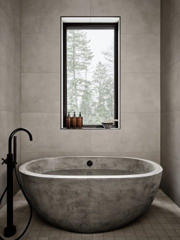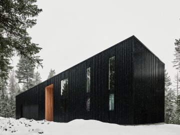 Dům tvoří dva vzájemně posunuté objemy se šikmými střechami. Fasáda je obložena černým kovem s proměnlivými žebrovými vzory, které připomínají strukturu kůry stromů. „Černá barva zrcadlí stíny, jež vrhá okolní les, a vytváří tak působivý kontrast se zelení krajiny,“ vysvětlují architekti. Vstup do domu je orientován na východ a zasazen do chráněné zátoky obložené dřevem z jedle kanadské. Tato útulná nika poskytuje úkryt před sněhem i deštěm.