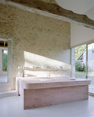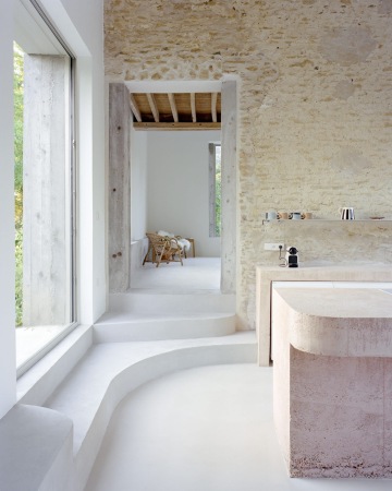 „Jako hlavní materiály našeho zásahu jsme zvolili beton, ocel a lakovaný hliník," vysvětlují architekti ze Studia Guma. „Jejich textury jemně kontrastují s minerální esencí původní struktury, zatímco jejich barevné tóny se snaží harmonizovat se stávající barevnou paletou." Tento projekt představuje vkusné spojení moderního designu s venkovskou atmosférou, která majitelům poskytuje jedinečný a pohodlný prostor pro rodinná setkávání a odpočinek.