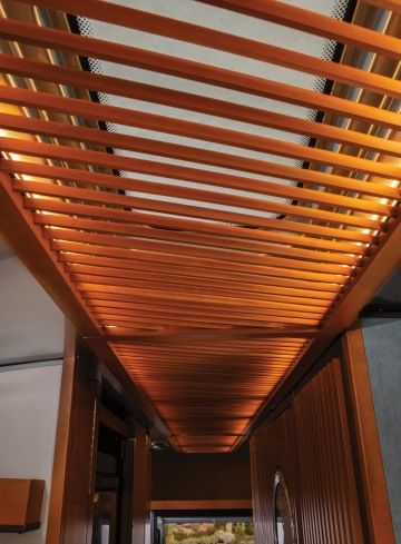 Interiér oplývá detaily, které spojují estetiku s funkčností. Dřevěné skládací židle, integrované pracovní kouty, posuvné prvky a chytré úložné prostory – to vše odráží Wrightovu filozofii praktického, ale krásného bydlení. Odnímatelné dřevěné lamely ve stropě jsou nejen funkčním prvkem, ale také vizuálním pojítkem s architektonickým dědictvím Taliesinu. Součástí vybavení je i zrcadlová skříňka na nápoje, ukrytá ve stěně – po stisknutí se otevře pomocí hydrauliky a odhalí interiér potažený červenou kůží. „Je to fascinující a záhadný objekt,“ říká Paolo Ferrari, hlavní designér projektu. „Skutečný vynález v prostoru.“