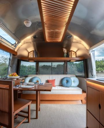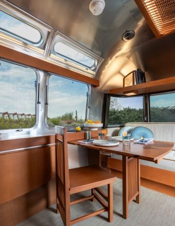 Zadní část karavanu přechází do obytného prostoru orámovaného dvěma pohovkami a výklopnými dveřmi. Obě sedačky lze rozložit na velkorysé lůžko velikosti king-size. Výklopné dveře pak celý prostor propojují s exteriérem a přinášejí do interiéru přirozené světlo i čerstvý vzduch. Karavan je prosvětlen jako žádný jiný model Airstream – celkem devětadvacet oken, včetně malých nadokenních průzorů ve stylu světlíků, odkazuje na Wrightovo mistrovství v práci s přirozeným světlem. Vnější roletky jsou inspirovány plátěnými panely, které zdobí střechy budov v Taliesin West, a karoserii obepíná jemný zlatý pruh, který podtrhuje eleganci celku.
