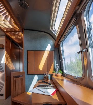 Spojení dvou ikonických značek – Nadace Franka Lloyda Wrighta a společnosti Airstream přineslo design, který je výsledkem spolupráce interních týmů z ohijské základny Airstreamu a ateliéru Taliesin West, Wrightova domova a studia v arizonském Scottsdale. „Design nevychází z jediné konkrétní stavby,“ vysvětluje Sally Russell, ředitelka licencování Airstreamu. „Inspirací byla estetika Usonie, období, kdy Wright pracoval s menšími prostory. Tohle je vlastně jedno z nejmenších usonských prostředí, jaké kdy vzniklo. Zároveň je zde přítomná modularita – multifunkčnost jednotlivých částí, což bylo pro usonské domy typické.“