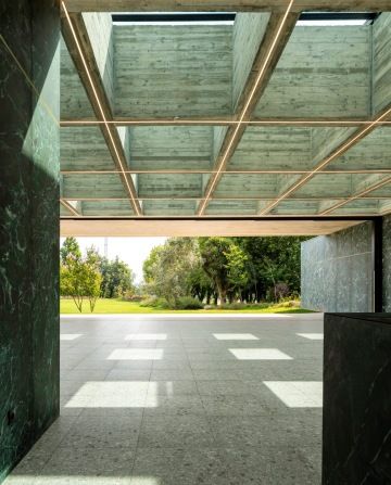 Materiálové řešení stavby reflektuje jak praktické, tak estetické hledisko. Zatímco střecha zůstává v surové betonové podobě s viditelnými otisky bednění, vertikální objemy jsou obloženy zelenou keramickou dlažbou s mramorovým efektem. „Výběr materiálů byl veden dvěma aspekty. Prvním byla snaha minimalizovat nároky na dlouhodobou údržbu – beton a keramický obklad fasády vyžadují jen občasné čištění. Druhým bylo úsilí začlenit stavbu do přírodního kontextu tak, aby co nejvíce splynula s okolním prostředím a zmírnila svůj vizuální dopad,“ dodává Marques.