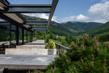 Letní terasa poskytuje ideální místo pro odpočinek, kde můžete nasát čerstvý horský vzduch, zatímco si vychutnáváte krásný výhled na strmý hřeben Kozích hřbetů, Luční horu nebo horu Stoh.