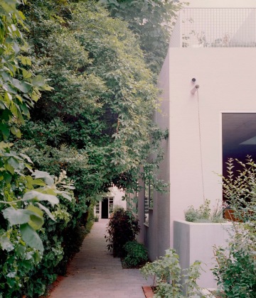 Střešní terasy se prolínají s okolní zahradou a nádvořím a vnější ocelová schodiště tak kolem domu vytvářejí dojem kontinuity. Po celé délce budovy se rozpíná průchozí dvůr s cihlovou dlažbou, obklopený stromy a zelení a vytváří jakousi malou městskou oázu.
