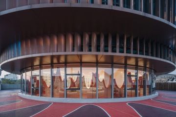 Zvenčí působí Ceramic Pages jako dynamická kombinace pevných a lehkých materiálů. Spodní úroveň knihkupectví obklopují masivní betonové stěny, zatímco horní válcová část je obložena perforovanými lamelami z hnědého kovu. Tento kontrast zdůrazňuje přechod mezi jednotlivými fázemi výroby keramiky – od pevné hmoty po jemnou estetiku.