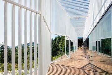 Clubhouse s výhledem a bílou fasádou