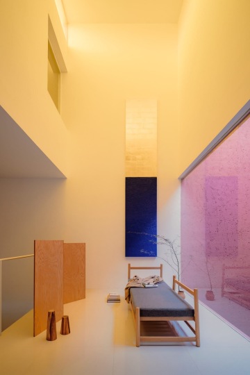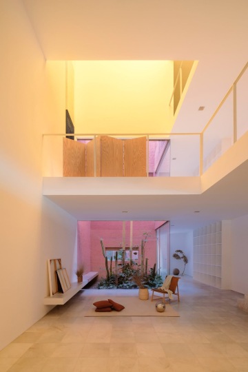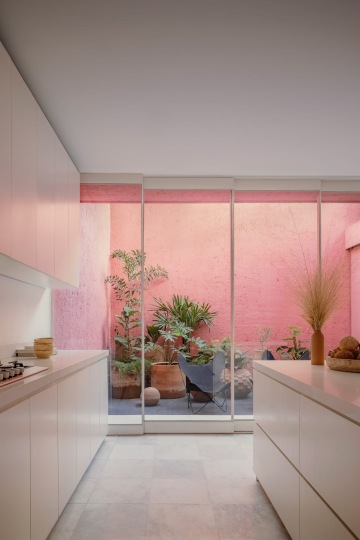 Interiéry domu jsou navrženy s důrazem na propojení dvou dvojitých výšek, které se vzájemně prolínají a prodlužují prostor. Přízemí hostí dvojitý obývací a jídelní kout, který se plynule otevírá do zahrady a zadní terasy. Okno v centrálním atriu, zabarvené do žluta, zalévá prostor slunečným světlem a kontrastuje s teplou růžovou paletou – efekt, který připomíná díla legendárního mexického architekta Luise Barragána.