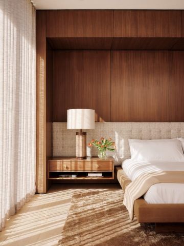 V nejvyšším podlaží se nachází čtyři ložnice. Hlavní ložnice, která nabízí únik od ruchu domácnosti, má vstup na soukromou terasu a působí mimořádně luxusně. Na zakázku vyrobená postel je zasazena do výklenku dřevem obložené stěny a místnost doplňuje vintage lustr od značky Venini a ikonická lounge židle s podnožkou od Cassiny. ,,Hlavní apartmá je skutečnou oázou klidu oproti zbytku domu," uvádí studio Woods + Dangaran. Součástí ložnice je také en-suite koupelna, jejíž dominantou je tmavě šedý kámen s bílým žíháním – stejný, jaký se objevuje i v kuchyni.