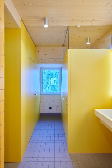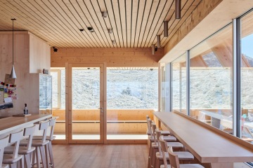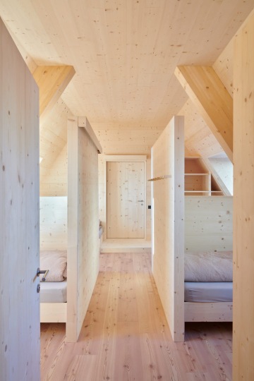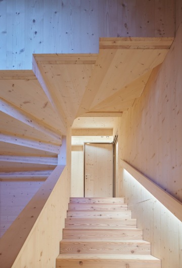 Interiér stavby je odhalenou smrkovou konstrukcí, která propůjčuje prostoru přírodní atmosféru. Tu doplňují jednoduché kovové prvky a výrazně žluté stěny v koupelnách. Malá okna vystupující z fasády rámují výhledy na okolní horskou krajinu a zajišťují dostatek denního světla v pokojích pro hosty. „Dřevo je dnes bezpochyby nejvhodnějším materiálem pro stavbu horských přístřešků – jeho nízká hmotnost, dobré izolační vlastnosti, možnost prefabrikace a ekologický aspekt mluví jasně v jeho prospěch,“ dodává Tammerle.