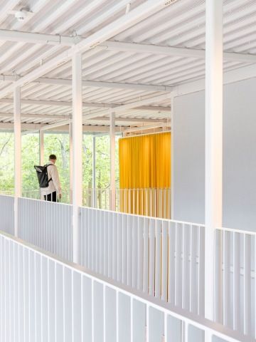 Interiér je vybaven zvukově pohlcujícími závěsy, které umožňují vytvoření intimnějších zákoutí. Akustické stropy a kobercové podlahy dále přispívají ke zlepšení akustiky prostoru. Design pavilonu pracuje s kontrasty: zatímco odvážné žluté závěsy dodávají prostoru energii, bílá ocelová konstrukce, světlé dřevěné akcenty a neutrální nábytek udržují prostředí klidné a vyvážené.