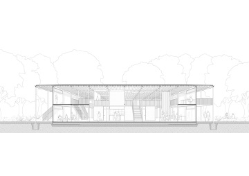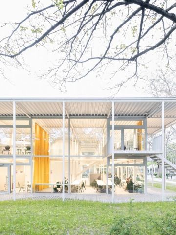 Hybridní konstrukce pavilonu kombinuje ocel a dřevo, což umožňuje vytvoření otevřeného přízemí a mezaninového podlaží, které je definováno modulární mřížkou 3×3 metry. Celoprosklená fasáda opticky propojuje interiér s okolním kampusem, a rozšiřuje tak možnosti dalšího využití prostoru. Přístřešek obklopující budovu zároveň poskytuje krytou arkádovou promenádu a obyvatelné balkony. Vnitřní uspořádání je inspirováno teoriemi architektů Cedrica Price a Yony Friedmana, kteří prosazovali myšlenku adaptabilní architektury fungující jako „prostorová infrastruktura“. „Idea superstruktury, v níž mohou lidé interagovat s prostorem, nám byla velkou inspirací,“ říká Düsing. „Tento koncept odráží myšlenku nehierarchického uspořádání, sociální infrastruktury a efektivní modularity.“
