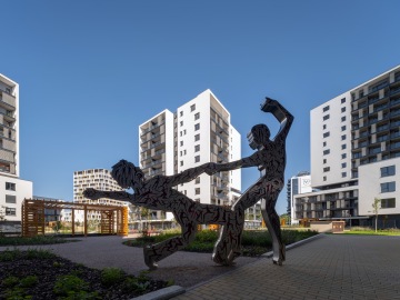 Velikost projektu je skutečně obdivuhodná. V celkem sedmi moderních budovách se nachází více než osm set bytů, jež svým obyvatelům nabízí úchvatný výhled na Hodkovičky a Vltavu. Mezi domy se pak nachází velkoryse navržené zelené plochy se stromy, hřištěm i loukami. Nechybí ale ani veškeré další zázemí a občanská vybavenost potřebná pro plnohodnotný život. „V projektu se nachází velká mateřská škola, supermarket Tesco a další obchody pro každodenní potřeby. A v neposlední řadě zde najdete i umění – umístili jsme sem sochy od známého českého umělce Michala Trpáka,“ dodává Yishay Furman.