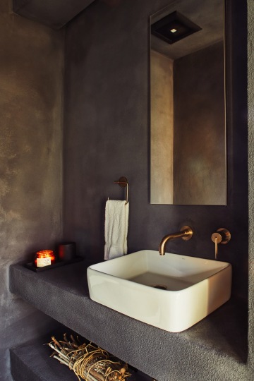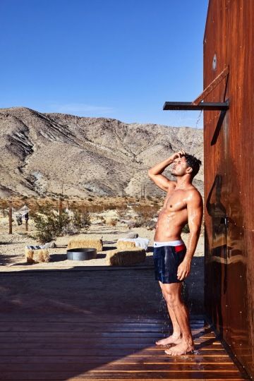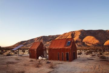 Chaty obepíná ocelové opláštění v kombinaci se širokými prosklenými plochami, což vytváří harmonický kontrast mezi industriální syrovostí a organickým prostředím pouště. Díky chytrému umístění velkých balvanů je zaručeno soukromí i v otevřené krajině. Hlavní relaxační zónou je venkovní terasa mezi oběma objekty, kde najdete unikátní koupel ve staré kovové galvanizované nádrži, typicky využívané pro napájení dobytka. Tento netradiční prvek dotváří autentickou atmosféru místa.