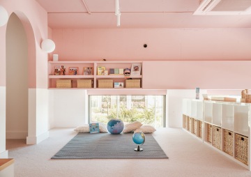 V prostředí školky je důležité, aby byly použité materiály nejen odolné, ale také příjemné na dotek. Delve Architects proto vsadili na recyklovatelné podlahy Marmoleum, javorové dýhované truhlářské výrobky a nátěry s nízkým obsahem VOC. Všechny povrchy mají navíc jemné, tlumené odstíny, které vytvářejí domáckou atmosféru a nenarušují soustředění dětí. Panel tmavě modrozelené barvy vede jako základní linie kolem stěn, čímž chrání nejnamáhavější místa před drobnými škrábanci. Horní stěny a strop pokrývá matná růžová, která se plynule prolíná se světlým javorovým dřevem. „V některých částech dosahují stropy výšky až pět metrů, takže jsme to chtěli vizuálně rozdělit a přiblížit dětem,“ vysvětluje Raher.