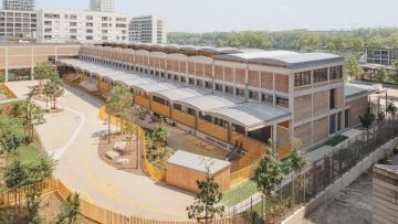 Bývalé velkoobchodní tržiště v Lyonu našlo nové využití jako základní škola a mateřská školka díky studiu Vurpas Architectes. Perforované cihlové zdivo a velká okna od podlahy ke stropu vytvářejí prosvětlené a funkční učebny, které respektují původní konstrukční síť budovy.
