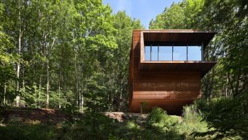 „Náš projekt se zrodil z touhy vytvořit klidné lesní útočiště, meditativní únik,“ vysvětluje Omar Gandhi, ředitel studia, které sídlí v Halifaxu a Torontu. Projekt si klade za cíl vyvolat auru tajemna a temnoty, přičemž kombinuje precizní řemeslné zpracování, neotřelý design, bohatou texturu a hru světelných efektů. Výsledkem je stavba, která nejenže harmonicky zapadá do okolní krajiny, ale zároveň nabízí dechberoucí výhledy na les a údolí.