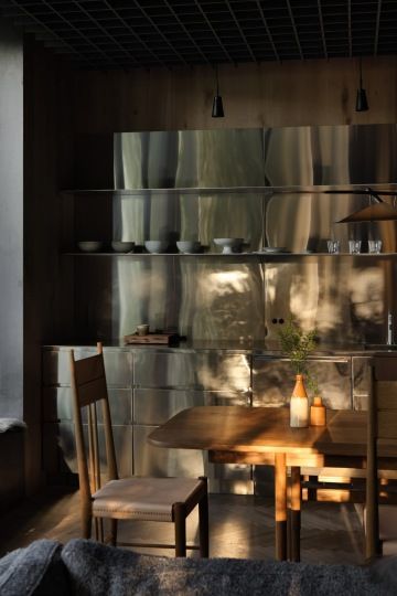 Uvnitř chaty se návštěvník setkává s promyšleným designem, který propojuje moderní materiály s tradičními prvky. Soukromé patro, přístupné přes tlumeně osvětlené schodiště, skrývá dvě ložnice vybavené starožitným ložním prádlem a ručně barvenými látkami. Velká okna odhalují dechberoucí výhledy na východ a západ, zatímco interiéry z kouřového dubu, doplněné o regály ze surové oceli a průmyslová svítidla, vytvářejí uklidňující atmosféru.