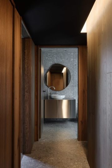 Poklop z oceli Corten otevírá cestu na střešní terasu, kde se pod širým nebem rozprostírá jídelní a obývací prostor a je obklopen japonskými javory. Z této úrovně se majitelům naskýtá panoramatický výhled na koruny stromů a okolní krajinu, která byla promyšleně zakomponována do celkového designu. Dešťová voda je pečlivě zachycována a využívána pro zavlažování, zatímco stávající stromy poskytují přírodní úkryt před letním sluncem.