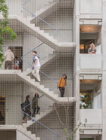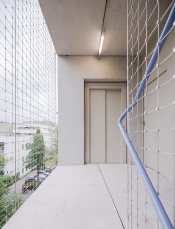 Důležitým architektonickým prvkem jsou venkovní schodiště, pokrytá nerezovou ocelovou síťovinou, která se vinou po straně budovy. Tato funkční komponenta není pouze praktickým prvkem, ale také vizuálně obohacuje fasádu a dodává jí industriální vzhled.