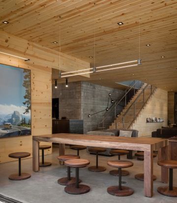 Hlavní dominantou AutoCamp Yosemite je dvoupatrová klubovna o rozloze přes tři sta metrů čtverečních, postavená v moderním minimalistickém stylu s důrazem na propojení s přírodou. ,,Použili jsme právě takový materiál, který rezonuje s prostředím Yosemite – regionální borovici, beton, ocel a sklo – to vše s čistým a minimalistickým detailem," vysvětluje Dan Weber, zakladatel studia Anacapa Architecture. V přízemí se nachází prostorné lounge zóny, komunitní stůl a ,,spa-inspirovaná" koupelna se sprchami obloženými ručně vyráběnými dlaždicemi. V klubovně najdete také bar nabízející craft piva, kombuchu a cold-brew kávu. Vedle toho je zde obchod, kde si hosté mohou koupit lokální produkty, BBQ sety, outdoorové vybavení a stylové oblečení. Horní patro klubovny slouží jako místo pro svatby, firemní eventy a další speciální akce. Dominantou je velká prosklená hala s výstupem na terasu s panoramatickým výhledem na vyhřívaný bazén a přírodní jezírko.